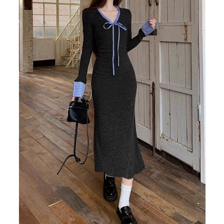 チェック柄の配色パイピングとリボンがポイントのロング丈ニットワンピース。