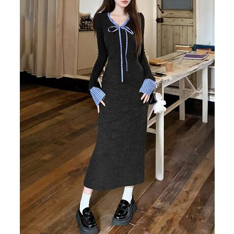 チェック柄の配色パイピングとリボンがポイントのロング丈ニットワンピース。