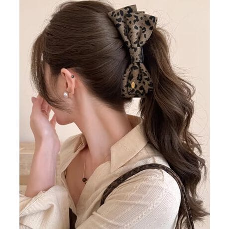 落ち着いたトーンのレオパード柄が大人っぽい印象のファブリックバナナクリップ。