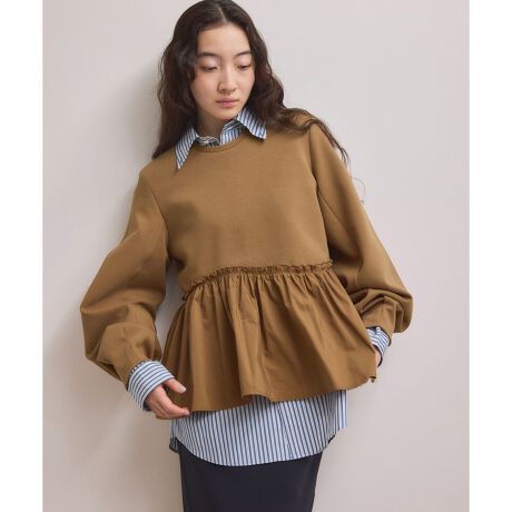 布帛とカットソーを使用した、アシンメトリーなデザインが新鮮なペプラムプルオーバー。