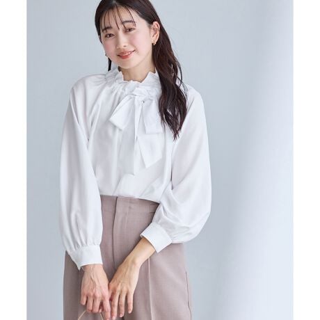・襟周りのフリルとフロントボウタイが着映え、顔まわりを華やかにみせるブラウスシャツ。