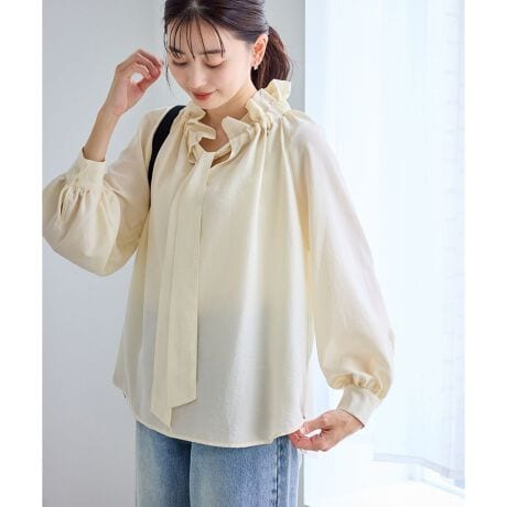 ・襟周りのフリルとフロントボウタイが着映え、顔まわりを華やかにみせるブラウスシャツ。