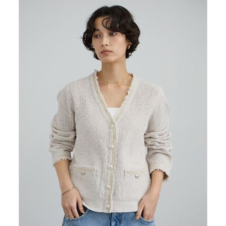 フリンジとベロアテープを前端と袖にあしらったVネックツイードジャケット。