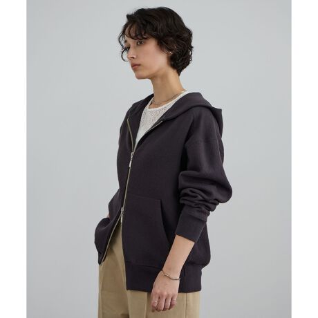 体を包み込むようなオーバーシルエットのフードニットパーカー。