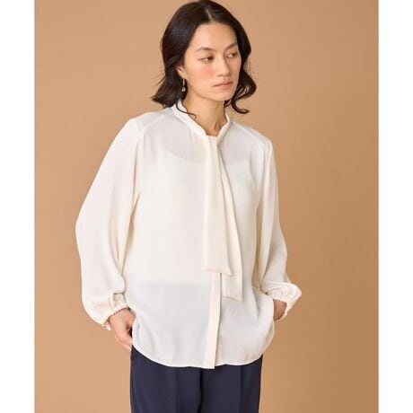 ■デザイン光沢感とドレープ感が特徴の上品なバックサテンジョーゼットを使用したボウタイブラウス。斜めに入れたデザインヨークと程よいボリューム感のある袖のデザインが、こなれ感のある雰囲気を演出します。トレンドのジレスタイルを格上げし、一枚でも様になるボウタイブラウスです。■素材光沢感とドレープ感が特徴のポリエステル100%のバックサテンジョーゼット。なめらかな落ち感のある上品な素材です。・水洗い可■サンプル撮影商品画像の商品はサンプルです。実際の商品とはサイズや色味、素材、デザイン等の仕様が若干変更になる場合がございます。■カラーについては、可能な限り実際の商品に近いカラーで撮影をおこなっておりますが、照明の関係により実際の製品とは色味が違って見える場合があります。またパソコン・スマートフォンなどの環境により、若干製品と画像のカラーが異なる場合もございます。現物と画像のカラー差異については返品理由となりませんので、予めご了承ください。■サイズ表記はあくまで目安となります。