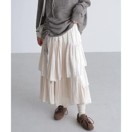 コーディネートを華やかに見せてくれるティアードスカート。トレンドのシャイニーな生地を使用しており、アシンメトリーに揺れるティアードデザインがポイント。動くたびに裾が揺れるフレアシルエットで、バランス良く見えるよう、左右のフリルバランスや段の入れ方などディテールにも拘った1枚です。ウエストはゴム仕様なのではき心地も良いです。ショート丈やミドル丈のトップスと合わせやすく、シーズンレスで楽しめます。ジャケットを羽織り、足元はブーツを合わせるのもおすすめです。※モデルの着用画像の場合、光の当たり具合により、実際の色味と異なって見えることがございます。色味は、商品単体の画像をご参照ください。