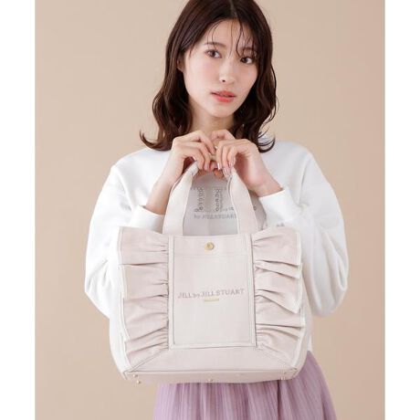 JILL by JILL STUARTのアイコンバッグ「フリルトート」5周年を記念して登場!ボリュームあるワイドフリルと額縁のような配色テープディテールがポイント。従来のフリルバッグとは異なるロゴの書体とサイズ、フリルも大人っぽく仕上げています。ハンドル部分には合皮素材を合わせて、品の良さと実用性も兼ね備えました。両脇にはスナップボタンが付いているので、荷物の収納量に合わせてフォルム調節ができます。中は便利なポケット付き。※撮影時照明の関係により、色味が違って見える場合がございます。またパソコン・スマートフォンなどの環境により、若干製品と画像のカラーが異なる場合もございます。予めご了承ください。商品の色味は、商品単品画像をご参照下さい。※商品画像はサンプルのため、色味やサイズ等の仕様に変更がある場合がございますので、予めご了承ください。