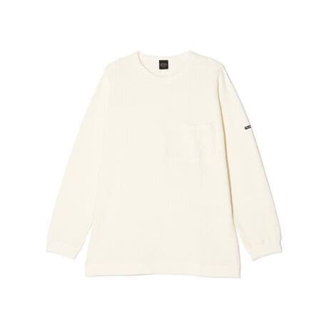 ・裾がストレートではなく、スウェットのようにリブ、そして胸ポケットも付いているおかげで、インナーぽさが消え、裾をアウトして着てもヒラヒラせず収まりが良く、L/S TEEよりはしっかりしていて、クルースウェットよりは軽く着れる、ちょうど中間的なのアイテムとして、1枚着からアウターのインナーまでと、汎用性が非常に高い