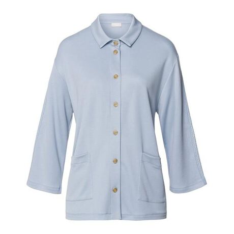 [型番:LIH725]袖部分にあしらわれたレースがエレガントな雰囲気を演出するラウンジウェアボディラインをひろいにくい、適度な厚みのある再生繊維(セルロース)混素材を使用したジャケットひじが隠れるくらいの袖丈で、冷房の効いた屋内でも重宝するアイテムパッチポケット付き