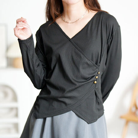 カシュクールデザインが女性らしさを引き立てるニットトップス。サイドにあしらった飾りボタンがさりげないアクセント。前裾をWラインに仕上げることで自然な立体感と抜け感を演出。上半身のバランスを整えてくれるのが魅力で、スマートな印象が完成。伸縮性があり動きやすく、チクチクしにくい優しい肌触り。お手入れも簡単だから忙しい毎日にも取り入れやすいのもポイント。きれいめにもカジュアルにも振れる万能さがある、頼れるニットトップスです。