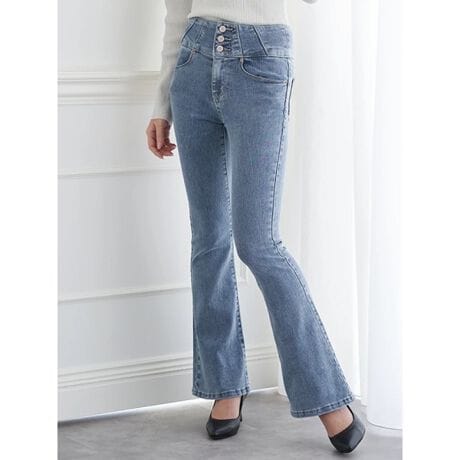 ウエストのボタンデザインがアクセントになり、脚のラインをすっきり見せるフレアデニム。