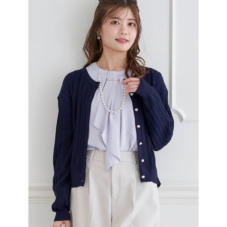 [型番:25580040329]縦リブの表情がすっきり見えを叶えるニットカーディガン。華やかなボタンが上品な印象に仕上がります。デニムで大人カジュアルに、スカートでエレガントにまとめても◎羽織りとしてもトップス感覚でも使える万能アイテムです。モデル(紺着用)身長:167cmMサイズ着用
