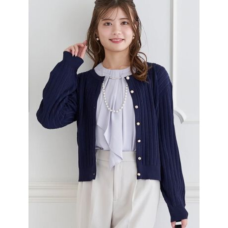 [型番:25580040329]縦リブの表情がすっきり見えを叶えるニットカーディガン。華やかなボタンが上品な印象に仕上がります。デニムで大人カジュアルに、スカートでエレガントにまとめても◎羽織りとしてもトップス感覚でも使える万能アイテムです。モデル(紺着用)身長:167cmMサイズ着用