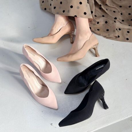 シンプルながらもグリッターヒールが存在感を放つ、上品なのにこなれて見えるデザインです。