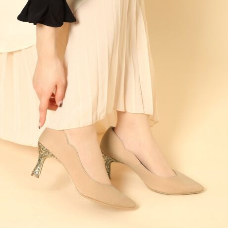 シンプルながらもグリッターヒールが存在感を放つ、上品なのにこなれて見えるデザインです。