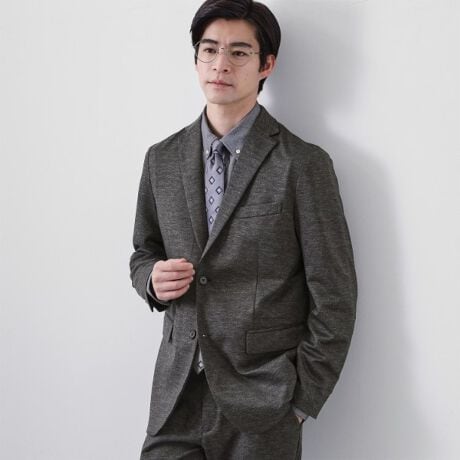 ・程よい張り感のある、タテヨコストレッチの効いたジャージ素材にウール調のマテリアルプリントをすることで、きっちり見えするけど着疲れしない素材を採用しました。