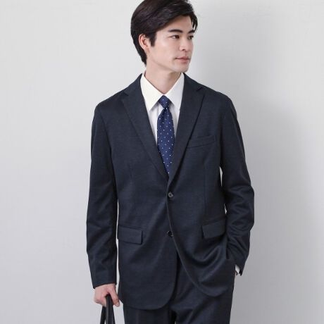 ・程よい張り感のある、タテヨコストレッチの効いたジャージ素材にウール調のマテリアルプリントをすることで、きっちり見えするけど着疲れしない素材を採用しました。