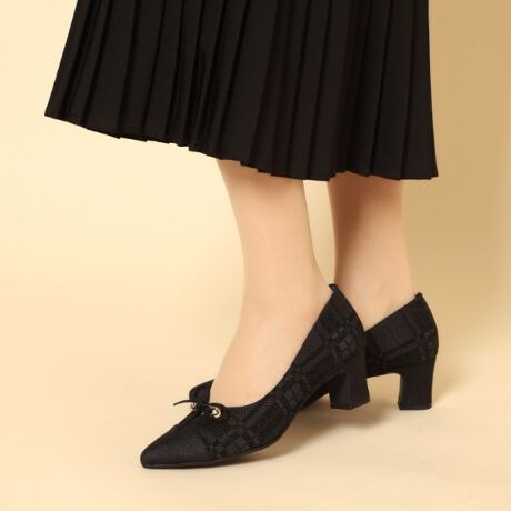 ポインテッドトゥに5.5cmのチャンキーヒールを合わせたリボン付きハートカットパンプスです。