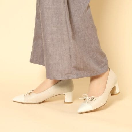 ポインテッドトゥに5.5cmのチャンキーヒールを合わせたリボン付きハートカットパンプスです。