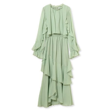 流れるようなフリルデザインが目をひくふんわりフェミニンな長袖ブラウスと、すっきりと仕上げたティアードスカートのセットアップ風ロングワンピが届きました。