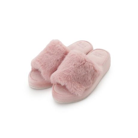 ふんわりとした甘めカラーのファーをたっぷりとあしらったルームシューズです。つま先を開けたミュール調のデザインなので、これから春先に向けてのシーズンにもぴったり。ややヒール高があるので、さりげなくスタイルUP効果も期待。インソールのかかとにはロゴ刺繍も入れました。同シリーズのファーヘアクリップと合わせたり、フリルロゴのニットシリーズやハート柄チュールのルームウェアシリーズとコーディネートするのもおすすめです。