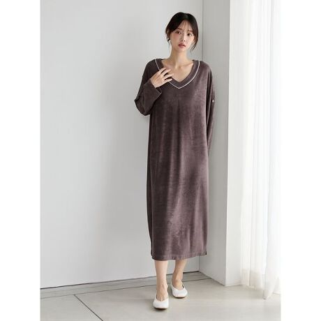 柔らかな風合いのパイル素材を使用した、シンプルな存在感のパジャマシリーズです。胸元に配色のパイピングを効かせた、年齢層を問わずお楽しみいただけるワンピース。身巾ゆったりで動きやすく、Vネックのデザインがリラックス感を漂わせます。袖口をまくって留められるボタンが付いているので、家事などをする際にも便利です。色は落ち着きのあるベージュとダークグレーの2色をご用意。ギフトにもおすすめのアイテムです。