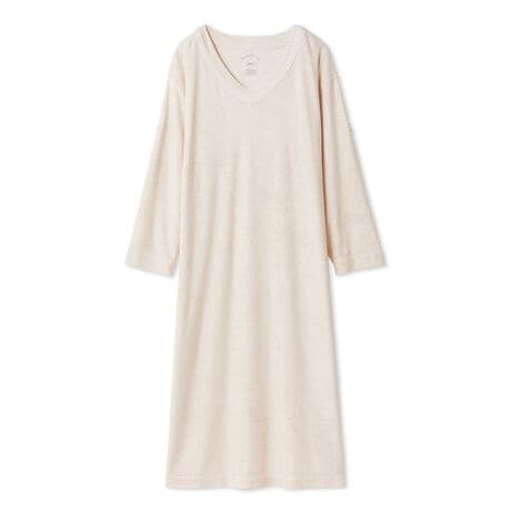 柔らかな風合いのパイル素材を使用した、シンプルな存在感のパジャマシリーズです。胸元に配色のパイピングを効かせた、年齢層を問わずお楽しみいただけるワンピース。身巾ゆったりで動きやすく、Vネックのデザインがリラックス感を漂わせます。袖口をまくって留められるボタンが付いているので、家事などをする際にも便利です。色は落ち着きのあるベージュとダークグレーの2色をご用意。ギフトにもおすすめのアイテムです。