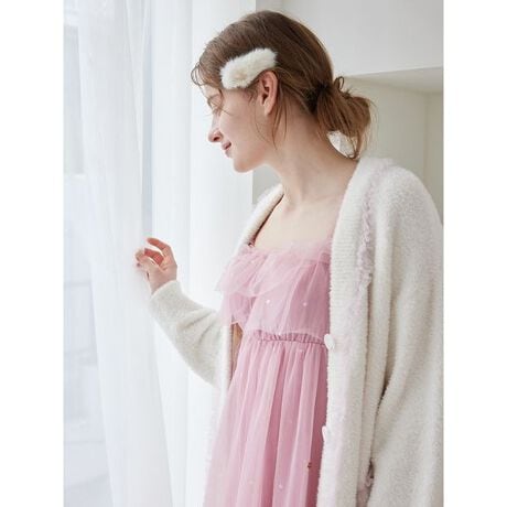 ふんわりとした甘めカラーのファーが可愛らしいヘアピンです。ゴールドのロゴ入りチャームをワンポイントであしらいました。前髪やサイドの後れ毛などを留めるのにちょうど良い大きさです。色はオフホワイトとピンクの2色展開。同シリーズのルームシューズと合わせたり、フリルロゴのニットシリーズやハート柄チュールのルームウェアシリーズとコーディネートするのもおすすめです。