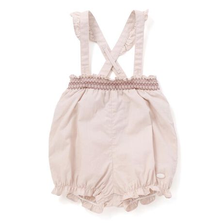 ブルマのウエスト部分をスモッキングし、フリル付きの肩ひもを付けたブルマパンツです。