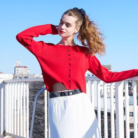 トレンドのショート丈×コンパクト見えのハイゲージニットカーデ。来春のキーカラー”レッド”を筆頭に気分の上がるカラーバリエーションでご用意しました。程よいコシのあるニットは上品さもありつつ旬のスタイリングに映えるコンパクトサイズ。少し長めの袖丈も華奢見えを叶えてくれる設計になっています。