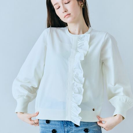 ・ブルゾン風なシルエット、幅広のフリル、スナップボタン、グログランテープ使いなどのディティールにこだわった、高見えするニットカーディガン。