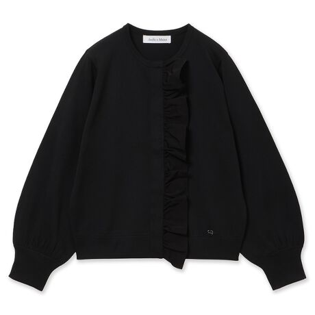 ・ブルゾン風なシルエット、幅広のフリル、スナップボタン、グログランテープ使いなどのディティールにこだわった、高見えするニットカーディガン。