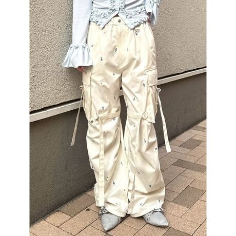 適度なハリ感のあるツイル目の素材を使用し、オリジナルの小花柄刺繍を施しました。メンズライクな太めのシルエットに膝周りにベルトディティールを加え、さらに動きやすく立体的なシルエットになるよう膝のタックも入れ、本格的なミリタリーディティールを取り入れた一着。相反するフェミニンな小花柄刺繍がアクセントになったFURFURらしいカーゴパンツになっております。