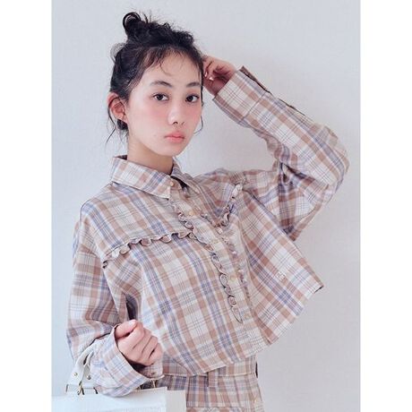 トレンドのショート丈×ワイドシルエットで抜け感のあるスタイルを演出するシャツ。前立てとヨーク部分には細幅のフリルをあしらいフェミニンなアクセントをプラス。金ドットボタンがさりげない華やかさを添え、裾には同色の2段ロゴ刺繍を施して上品な印象に。全色チェック柄の生地を使用しており、同素材のプリーツスカートRWFS261089とのセットアップコーデもおすすめです。