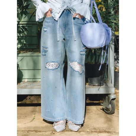 ひげ加工を施しヴィンテージライクに仕上げたデニム。全体に銃弾を打ち込んだようなホールクラッシュとダメージを加え、クラッシュ裏面にレースのあて布を叩きつけることで甘辛MIXな印象に。タックを入れて生まれたルーズなシルエットも今年らしいポイント。カラーはブラックデニムにピンクオーバーダイを重ねたBLK、定番のSAXの2色展開。