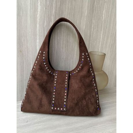 今季のキーワードであるスタッズを贅沢に施した存在感抜群のバッグ。ほどよくマチを持たせることで、荷物を入れてもシャープな印象をキープできるバランス設計に仕上げました。素材はこなれ感のあるシワ加工のフェイクレザーを採用し、ブラウンのみスエード調にマルチカラーのスタッズを組み合わせた特別仕様。手持ち・肩掛けどちらも使いやすいハンドル長でデイリーに活躍します。内ポケット付きで実用性も◎。シンプルコーデのアクセントにも、モードなスタイリングにもマッチする、今季らしいアイテムです。