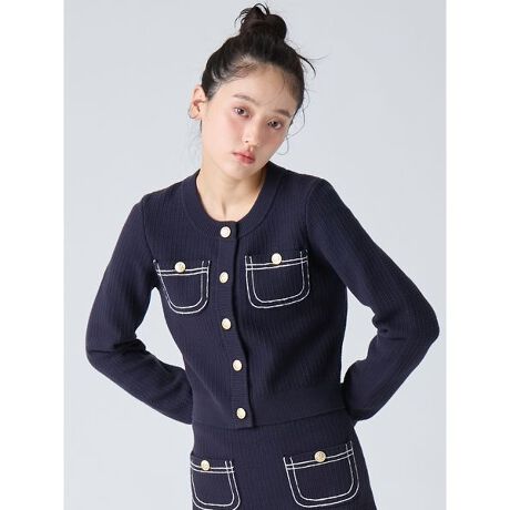 しっかりと肉感のある素材と、コンパクトすぎないサイジングでジャケットのように羽織れるニットトップス。配色ステッチ風の刺繍を施したポケットを高めの位置に配置し、自然と目線が上がることでスタイルアップ効果も期待できます。ぽこぽことした凹凸感のある地柄が印象的で、カジュアルにもきれいめにも合わせやすい万能デザイン。同素材のコットンニットミニスカート(品番LWNS261117)とのセットアップスタイルもおすすめです。