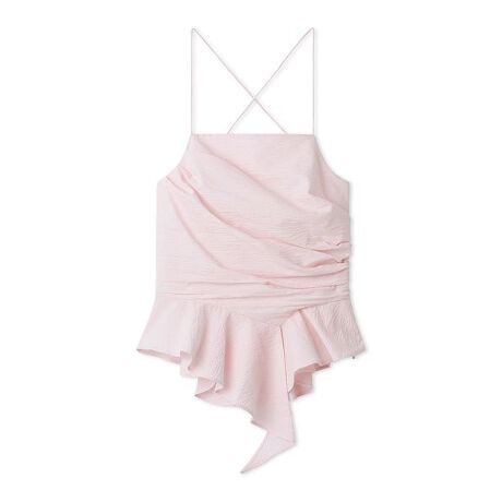 綿ライクな素材感で各色ごとに異なるテキスタイルを使用しております。前身頃に動きのあるタックデザインを入れ、裾に流れるようなフリルをあしらったキャミソールのビスチェです。中に薄手のインナーを合わせていただけるように、うしろにシャーリングゴムを入れて程よく身体にフィットさせたサイズ感で、左脇のコンシールファスナーで着脱可能です。また後ろのリボンで肩紐の長さ調節をしていただけるのもポイント。同素材のRWFS261152とセットアップで着用し、ワンピースのように合わせるのもおすすめです。