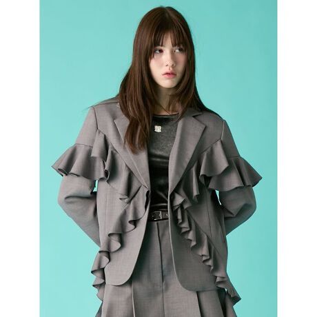 シワになりくく、さらっとした肌触りのきれいめな素材を使用。袖から裾にかけて同素材で作られたラッフルフリルを大胆に施したデザインジャケットです。ややオーバーサイズのシルエットがこなれた印象に仕上げてくれるのもポイント。テーラードのかっちりした印象を柔らかくフェミニンに落とし込んだFURFURらしい一着になっております。同素材のRWFS261077とセットアップでの着用もおすすめですが、コーディネートで他のアイテムとも合わせやすいようにベーシックカラーでご用意いたしました。