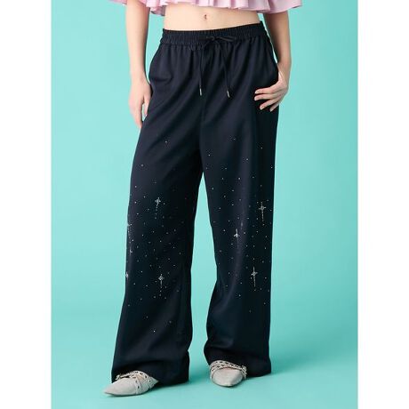 天の川をイメージした細やかなビジューを全体に散りばめた華やかなイージーパンツ。メンズライクなスーツ生地を使用し、ややワイドめのシルエットにあえてイージーなウエストゴムのデザインに仕上げました。