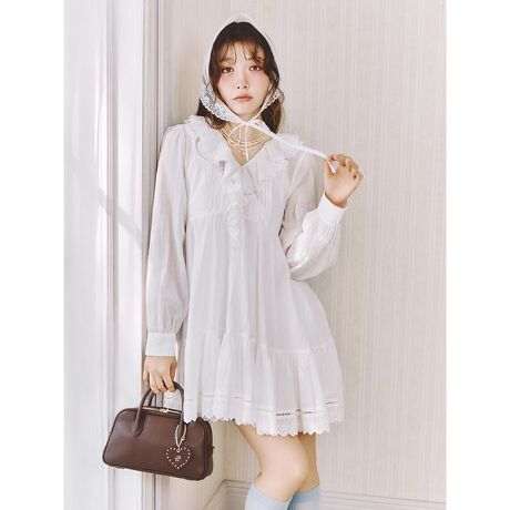 やわらかなコットン生地で仕立てた、華やかさあふれるミニワンピース。裾にはハシゴレースとスカラップ刺繍レースを贅沢にあしらい、軽やかで繊細な表情をプラスしました。フロントホックと後ろのレースアップによって衿ぐりの開きを調整できる仕様です。前後着用可能なデザインで、気分に合わせてニュアンスの違う着こなしが楽しめます。衿周りにはたっぷりのラッフルを施し、ふわりと広がる分量感がフェミニンなムードを演出。インナーキャミソール付きです。<b>
