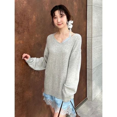 カシミヤ混の柔らかなニットに、サテンキャミワンピースを組み合わせたセットアイテム。ニットは上品な風合いと心地よい肌触りが魅力で、オーバーサイズシルエットによりリラックス感のある着こなしが叶います。サテンキャミワンピースは、アシンメトリーなラインに加え、衿ぐりと裾に繊細なレースをあしらい、センシュアルでフェミニンな佇まいに仕上げました。それぞれ単品でも活躍し、幅広いスタイリングが楽しめます。<b>