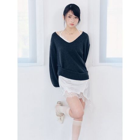 カシミヤ混の柔らかなニットに、サテンキャミワンピースを組み合わせたセットアイテム。ニットは上品な風合いと心地よい肌触りが魅力で、オーバーサイズシルエットによりリラックス感のある着こなしが叶います。サテンキャミワンピースは、アシンメトリーなラインに加え、衿ぐりと裾に繊細なレースをあしらい、センシュアルでフェミニンな佇まいに仕上げました。それぞれ単品でも活躍し、幅広いスタイリングが楽しめます。<b>