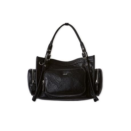 ヴィンテージ感のある柔らかなフェイクレザーを使用した、横長シルエットのトレンド感のあるバッグ。便利なアウトポケットを表面と両サイドに配置し、すべてファスナーで開閉可能になっています。ハンドルはバックルで長さ調節ができ、マグネットボタンで本体の開閉もスムーズ。チャームが付けられるDカンを付け、細部にもこだわった一品です。