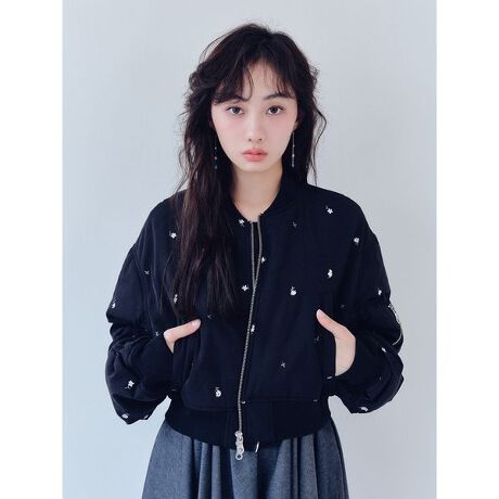 柔らかいツイル目のやや光沢感のあるナイロン生地を使用し、オリジナルの小花柄刺繍を施しました。ショート丈かつワイド感のあるシルエットで程よくゆとりがあるので、スウェットなどオーバーサイズなトップスの上から着てももたつかずに着用いただけます。薄く中綿を入れているため、ボリュームが出てまだ肌寒い季節にもおすすめのアウター。編み立てた衿・袖・裾のリブは柔らかくフィットしてくれるので、防寒機能もしっかりあるアイテムです。同素材のRWFO261081とのセットアップ着用もおすすめです。