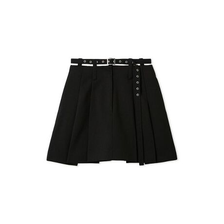 シワになりくく、さらっとした肌触りのきれいめな素材を使用。スラックスパンツを切ったようなタックデザインがポイントのミニスカートです。ベルトループが上下に2つ付いており、一番上には共地のベルトを通し、下には別のベルトを通すことでWベルト仕様で着用いただけるモードなアイテムになっております。裏地がパンツ型になっているのでインナーを気にせずに着用いただけるのも嬉しいポイント。