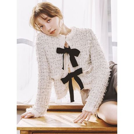 しっかりと輝きを放つホイルヤーンに、質感の異なる複数の糸を組み合わせて編み立てた華やかなニットジャケット。フェイクポケットには上品にきらめくビジューボタンをあしらい、フロントは存在感のある大きなベロアリボンで印象的に仕上げました。裏地付きで型くずれしにくく、保温性にも優れているため、季節の変わり目にも活躍。コンパクトなショートパンツと合わせたフェミニンスタイルから、デニムでカジュアルダウンした着こなしまで幅広く楽しめる一着です。