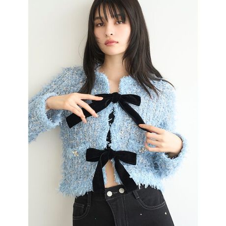 <b>【ホイルヤーンが華やかに煌めくベロアリボンニットジャケット】</b>