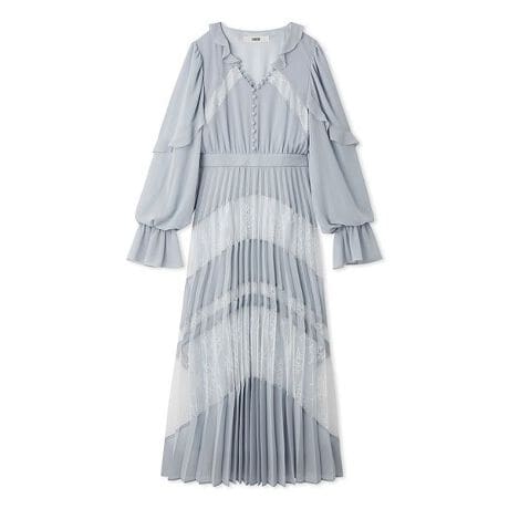 レースとシフォン素材をカーブ状にはぎ合わせ表情豊かに仕上げたドレス。スカート部分にはプリーツ加工を施し、立体感とソリッドさをプラス。袖はたっぷりギャザーを入れ、シフォンの特性を活かしたふんわりシルエットに。衿周りから前身頃にかけて密度高めに配置したボタンでトレンド感を演出しました。衿と袖の端始末には切りピコを施して細部まで繊細さにこだわった一着。