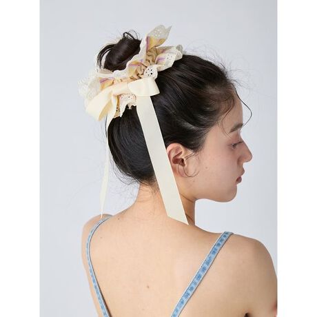 大胆に揺れるリボンが目を惹く、存在感たっぷりのシュシュ。ブラックとホワイトにはコットンレース、イエローにはストライプ、ブルーにはチェック柄を採用し、春らしい軽やかなカラー展開に仕上げました。内側にはゴムを内蔵しているため、髪をまとめてからシュシュ本体を被せることで、より美しいシルエットで着用が可能。アップスタイルにもハーフアップにも映える、着こなしのアクセントにぴったりなアイテムです。